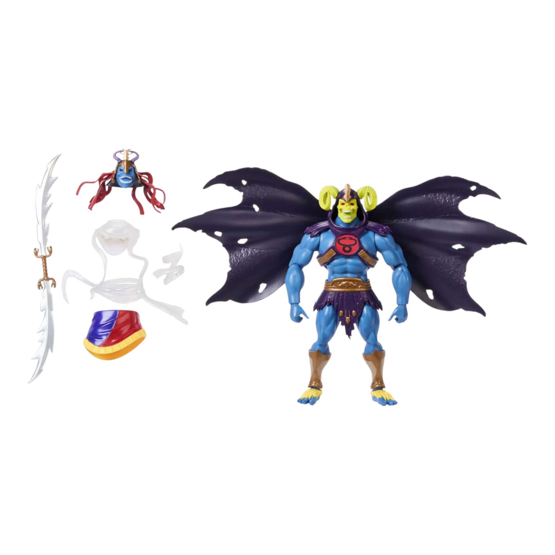 Prepárate para el crossover más épico del multiverso. La figura Skell-Ra combina a dos de los villanos más legendarios de los años 80: Skeletor de Masters of the Universe y Mumm-Ra de Thundercats, dando origen al mal supremo de Eternia.